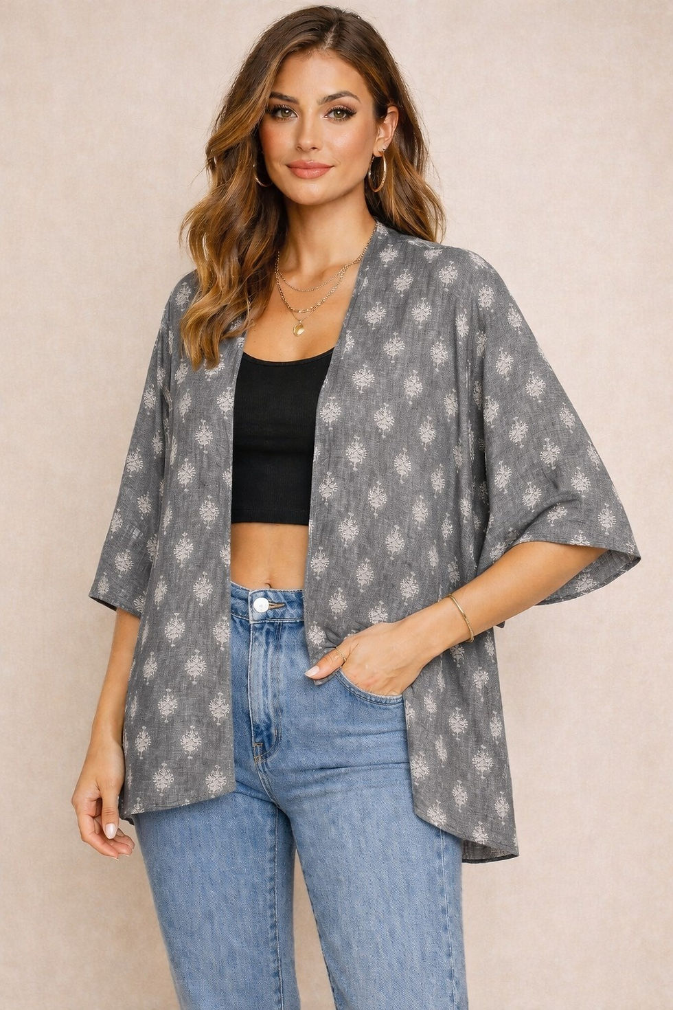 Women Printed Open Front Grey Shrug